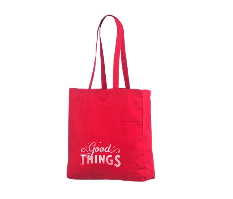 Dessa röda bredbottnade tygkassar tillverkas av 220 gsm bomull. Kassarna har långa handtag så att de är bekväma att bära över axeln.